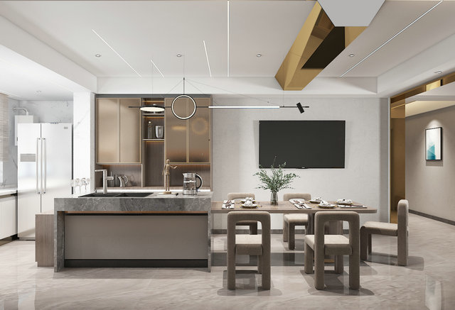 本案為好多年前的房子,業主也是新買的二手房。原室內裝修為簡約風格,頗為奢華。業主就喜歡年輕時尚的元素,喜歡金色,本案已是提煉出部分金色來點綴。原廚房于陽臺處,結構極其不實用,灶具和水槽空間狹小,故而使用餐廚一體化,原陽臺廚房作為物料收納區域,活了整個空間感覺和實用性。因為老房子,個人不喜歡裝修完看到梁,又要做出大宅該有的氣勢,故而做了這樣一個設計。所有裝飾皆為處理空間細節問題而生,無浮夸造型。本案為現代簡約風格,因樓層實在不高,故而用了分體空調。