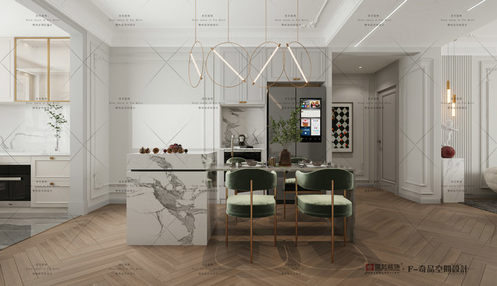 天然紋理的石材島臺,造型上與背景墻線條元素相呼應,更具視覺延伸感,為生活增添了儀式感。陳設的三兩組軟裝使空間靈動而優雅,隨性打開的書本恰好點亮了室內的文藝氛圍。仿佛還原了與家人聊天、品茶、閱讀的生活情境,在空間藝術韻律的熏陶下,演繹極具個性的法式輕奢風情。