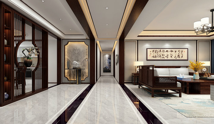 設計說明:中國人寄情山水之意,奠定了東方審美的基調——即:閑情逸致式的性情陶冶。臨望高山,俯眺流水;古人在山水面前頓悟圓覺,所謂“道、理、性”終匯歸為天人合一的憂樂意識?!墩撜Z》曰“智者樂水,仁者樂山?!庇芍哉J知為出發,古人以為天地之氣凝而為山,融而為川;氣和人相通,山水與人也就自然存在著同脈交感的內在聯系?!皻狻蹦嗣?,衍化流暢方為自然之本;“以山為德,以水為性”,煙淡嵐輕,引納入室,靈動怦然。以“閒”為序,喻空間摒棄外界煩擾;一門之隔,便是兩個世界。清秋蟲鳴,朗月灑暉,挽風入室;歸來已是萬家燈火,邁入此中,便是“閒”了。清風明月本無價,遠水近山皆有情。歐陽修的體悟不拘泥于山水真實的客觀存在,更在乎個人情感主觀自然的表達。