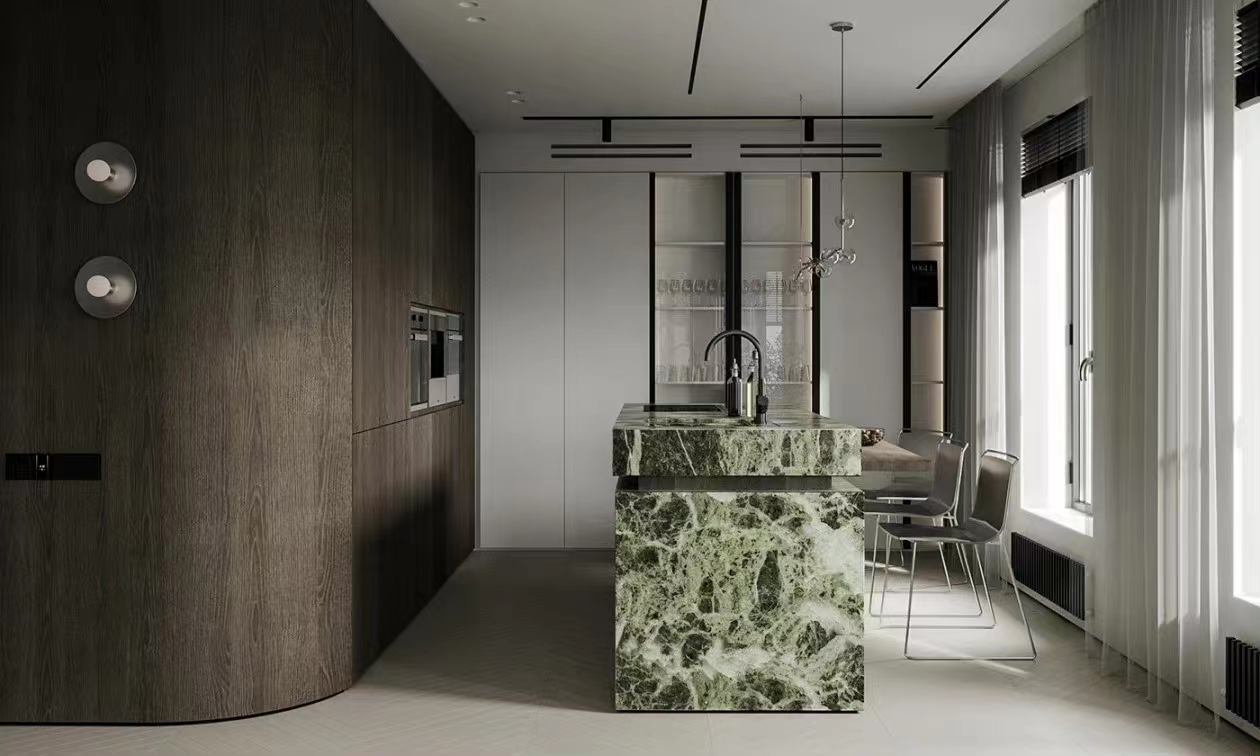 把大理石應用在現代風格廚房中,就有了高貴奢華的氣息,大理石中深色的紋路增加了廚房的抽象藝術感覺。