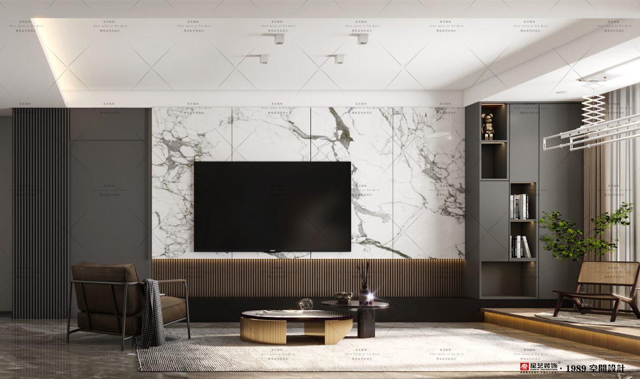 客廳現代輕奢風格裝修效果圖,客廳無主燈設計,白色大理石電視墻背景墻,增加輕盈、層次感。淺色奢石巖板呈現高級感,溫潤的深色木質格柵很好的拉近了距離感。