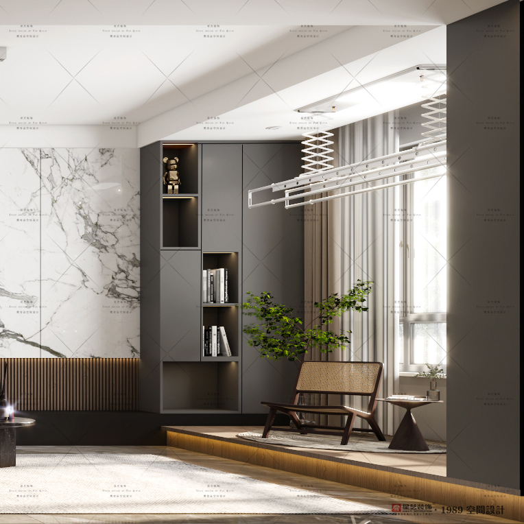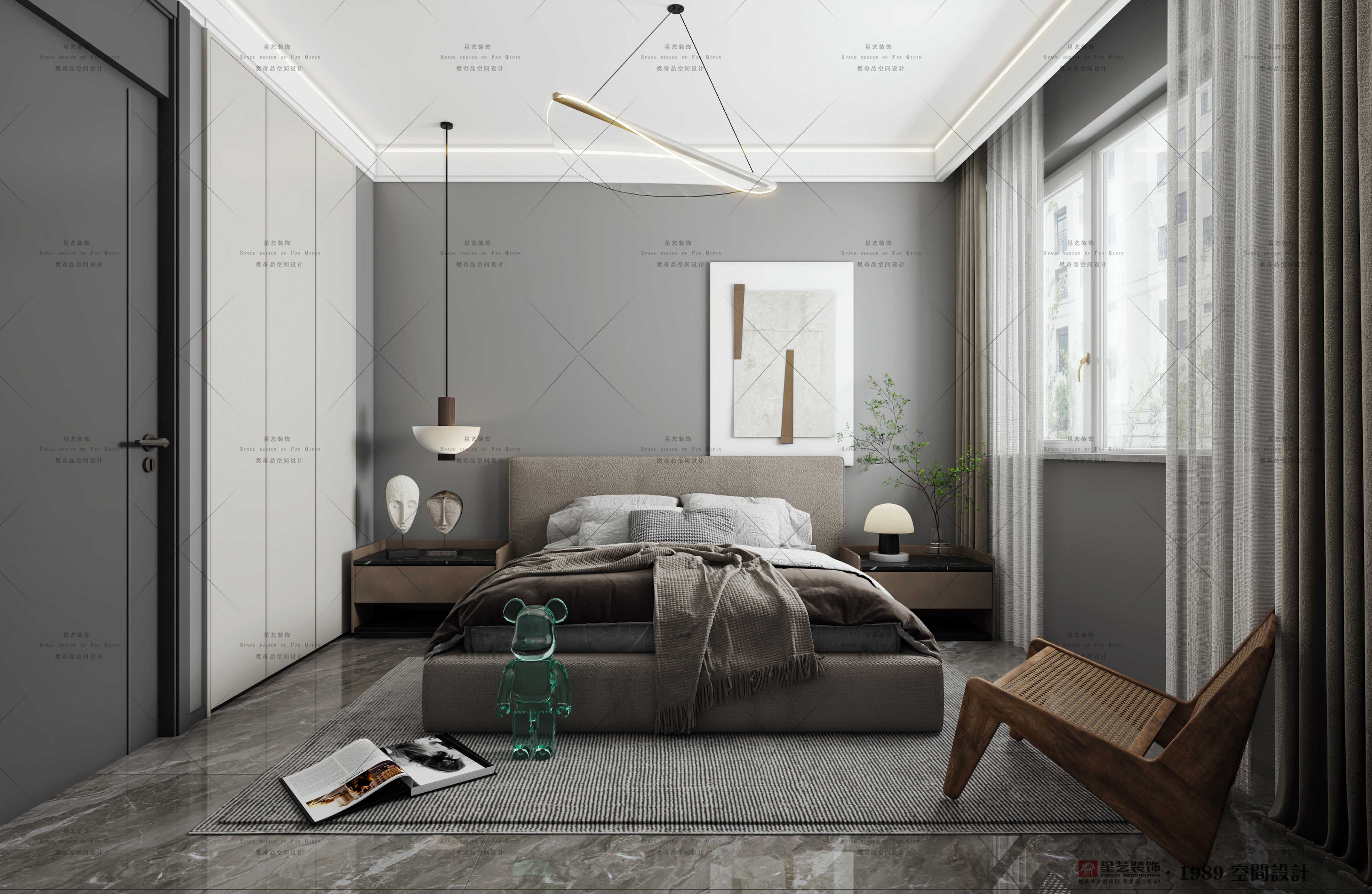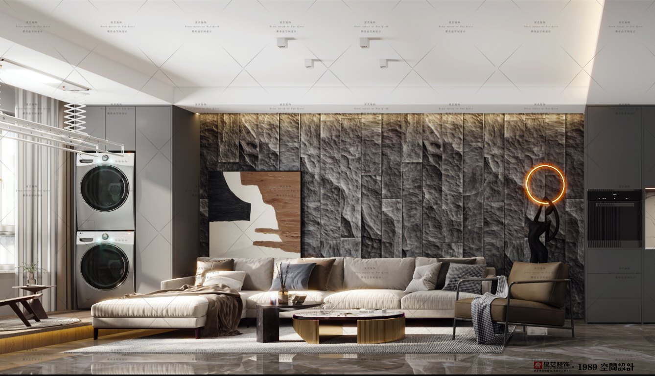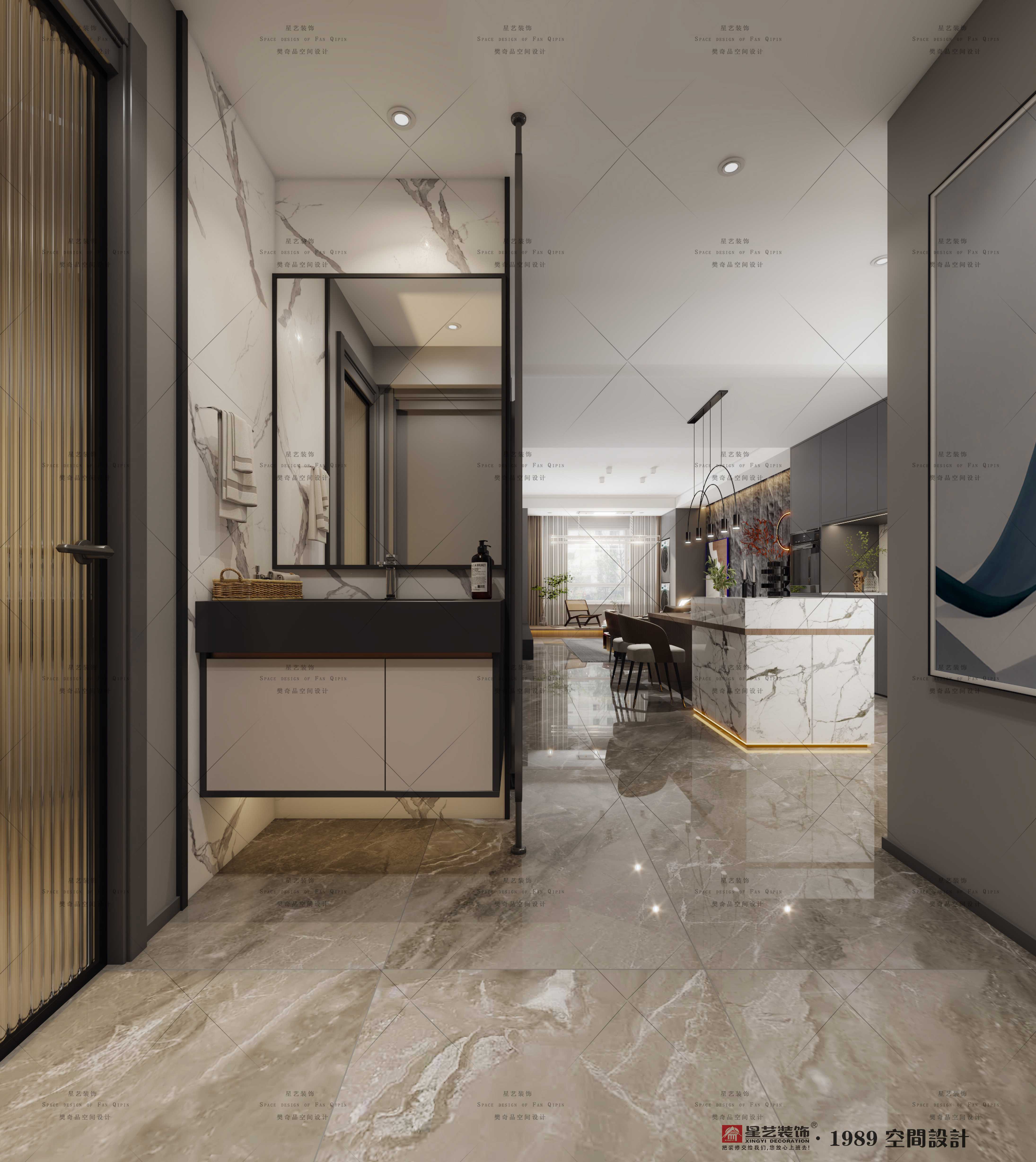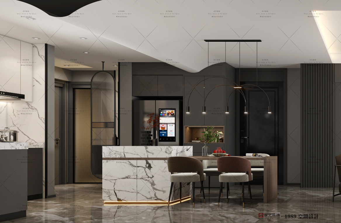 客廳與餐廳空間以一種開放化的形態打開,墻面整體以護墻板制作,在電視背景墻造型上添加燈帶,提升了空間的整體質感,融當代生活方式與藝術生活于同一空間,冬日灰與天空灰的色彩碰撞,隱去客廳的邊界,沉靜高雅的自然氣質無限流露,簡約奢華的家具、精致的擺件營造出家的情境和氛圍。