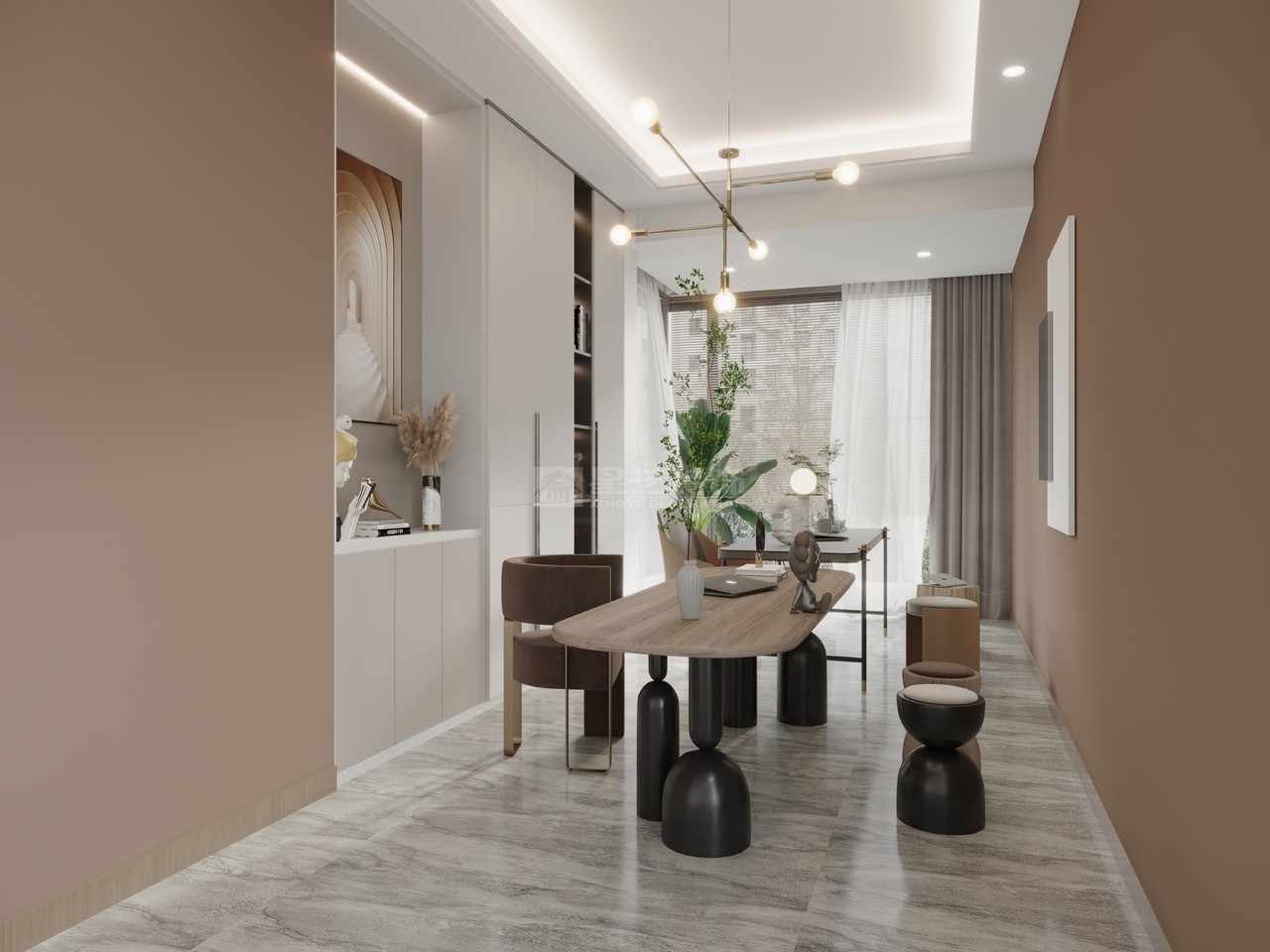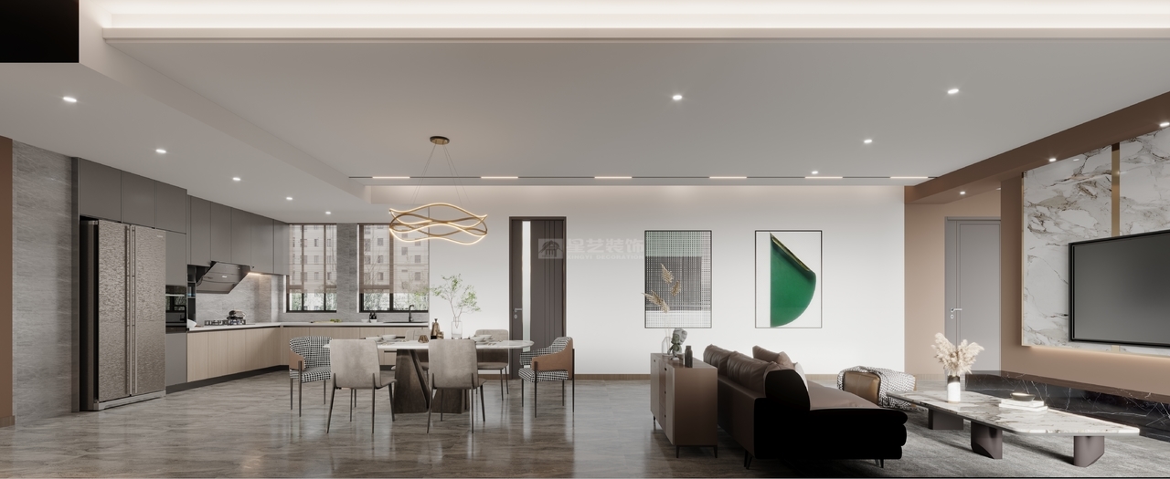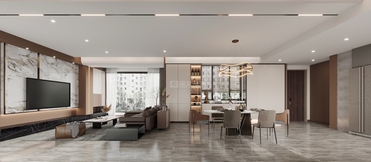 設計理念:不一樣的高雅輕奢風,以極簡主義作為基調,通過一些精致、高檔的軟裝元素來展現質感,讓空間顯得精致、低調與內斂,比簡約考究、比奢華自由。 陽光通過客廳穿透到餐廳的每一個角落。無主燈設計加上幾何吊頂,讓空間顯得簡潔而又獨特。獨立的電視背景墻兩旁是通透的埡口,讓人忍不住探索神秘的面貌。金屬配色的質感,現代感十足,在不經意的細節中舒緩著輕奢優雅。