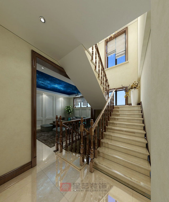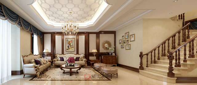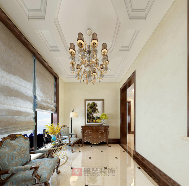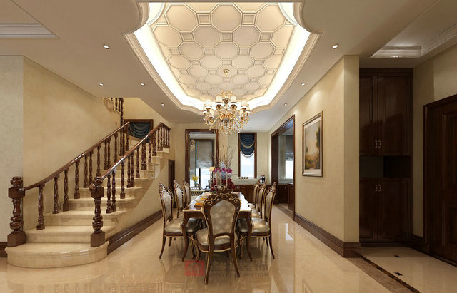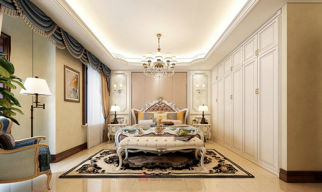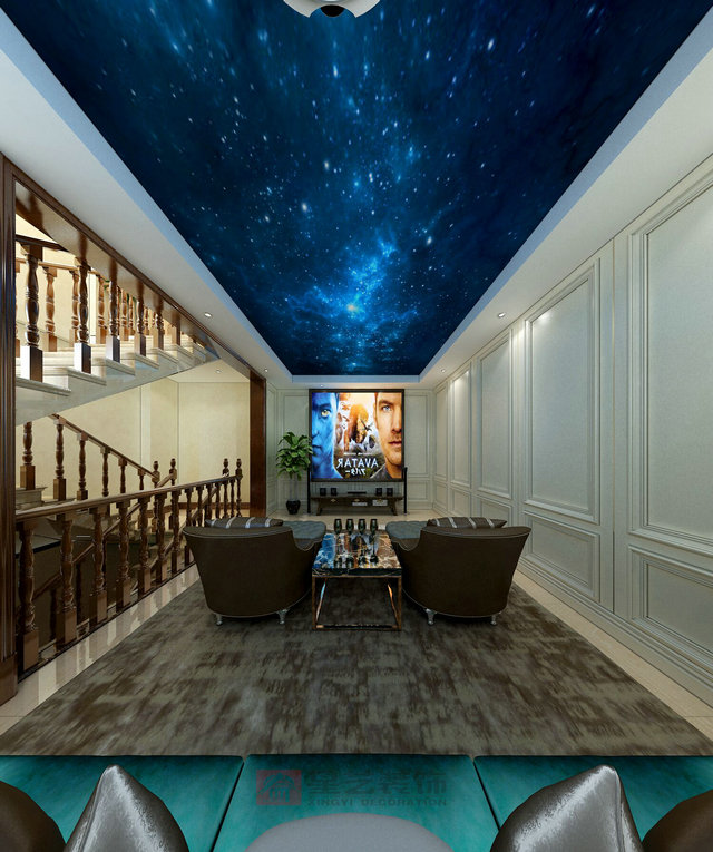 客廳天花茶色立面,展現工藝掘起精湛細緻,佐以黑色鐵件與燈帶引導視覺延伸空間尺度。落地窗前分別以深淺色大理石材鋪敘佐異材質搭配,藉以色彩與燈光渲染豐富空間的視覺層次。吧臺代替了餐廳,使空間兼備吃飯,品酒功能,構成便利動線,雙面以大理石、鈦金屬與玻璃異材質銜接,整合展示收納,滿足兩個場域的雙功能性。主臥房天花以細窄框塑牆體天花,細琢工藝表現石膏線觸感層次。睡眠區以皮質硬包為主牆,天花同以極細藍線段呼應,衣柜以實木皮為內佐鐵件茶玻搭配,烘托細緻感受。
