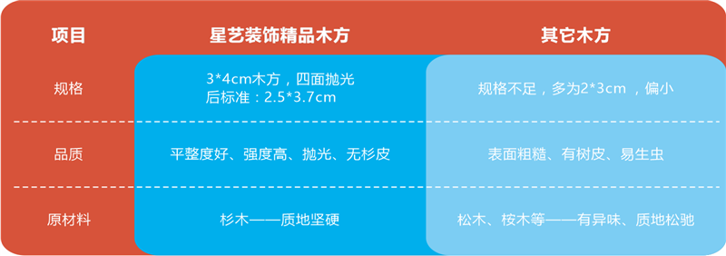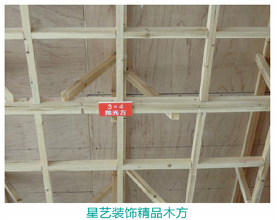 真材實料更穩固星藝裝飾集團首創,將杉木根據公司指定標準(3.7*2.5)加工鋸切成方形條木,并實行壓刨四面拋光處理,主要使用于家居天花吊頂。