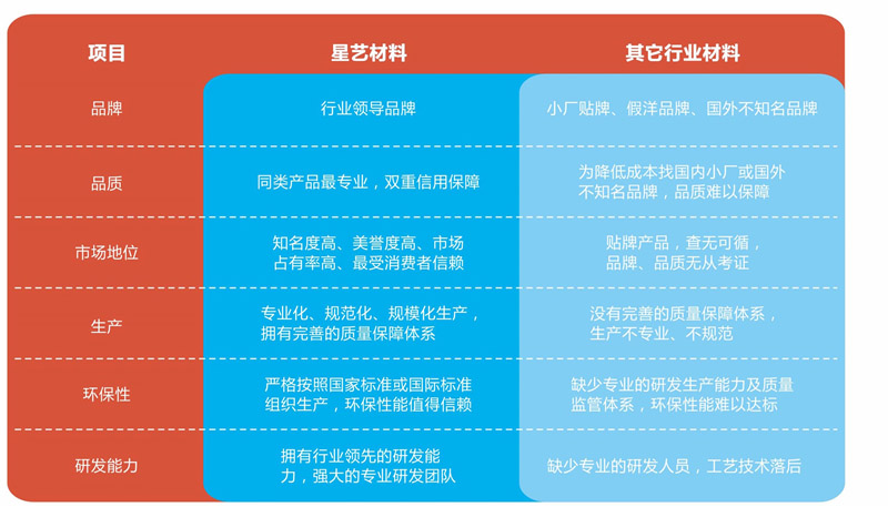 ■ 星藝與材料領域最為優秀的企業建立長期穩定的合作伙伴關系,確保星藝在同類產品中以最先進的科技和最優質的產品奉獻給廣大的業主。